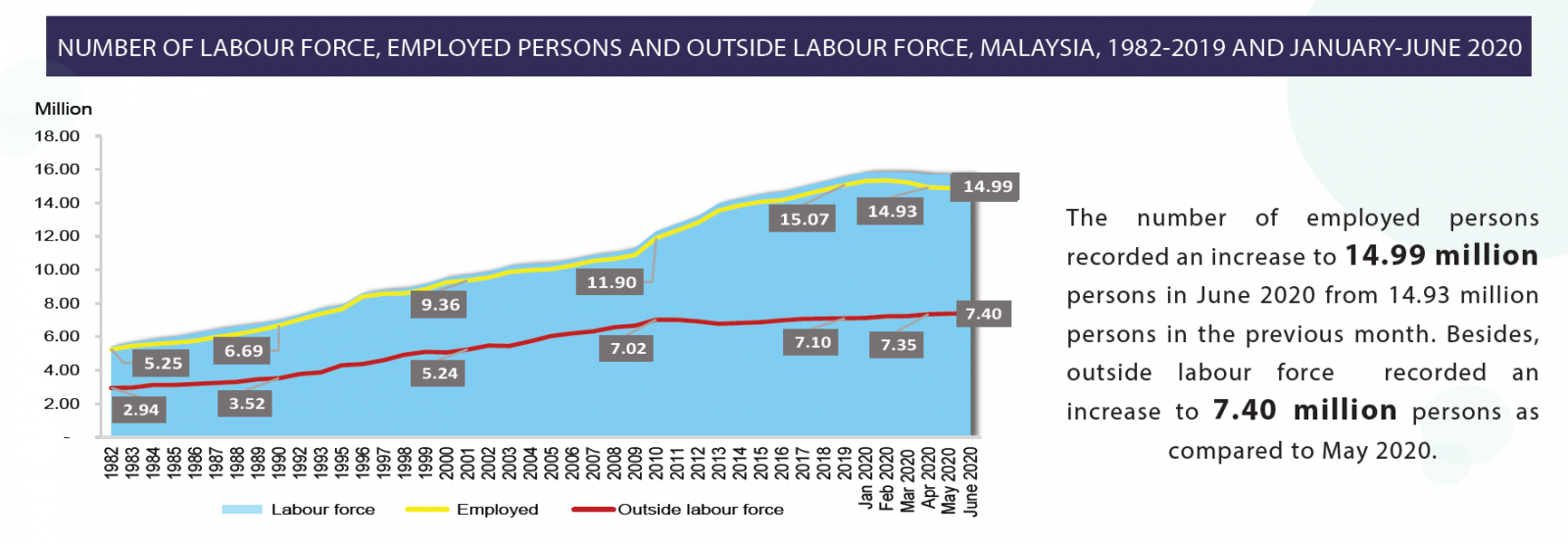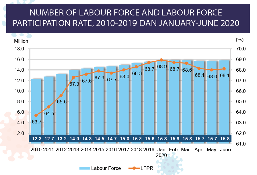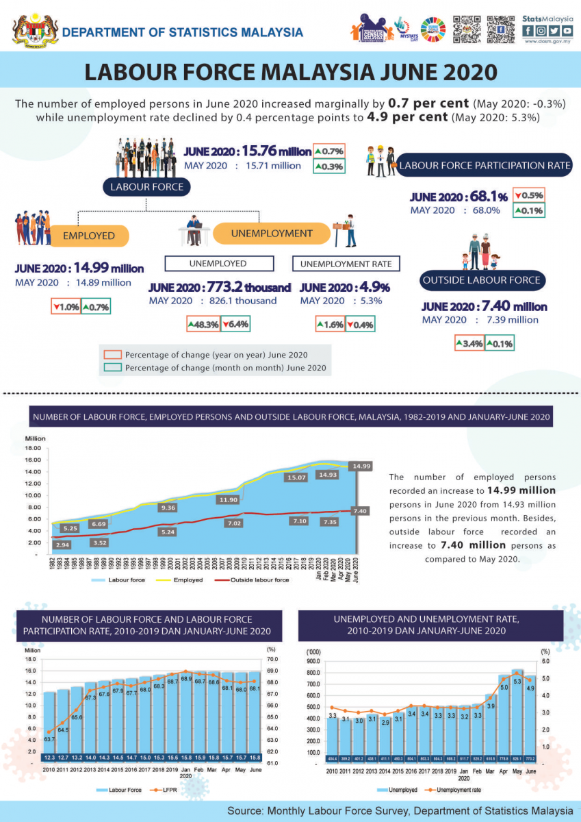 The opening of more economic activities since 10 June 2020 initiated more positive impact with an increase in the number of labour force by 49.5 thousand persons to record 15.76 million persons as compared to May 2020.