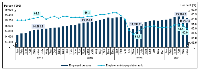 Chart 1: Employed persons and employment-to-population ratio, January 2018 - June 2021