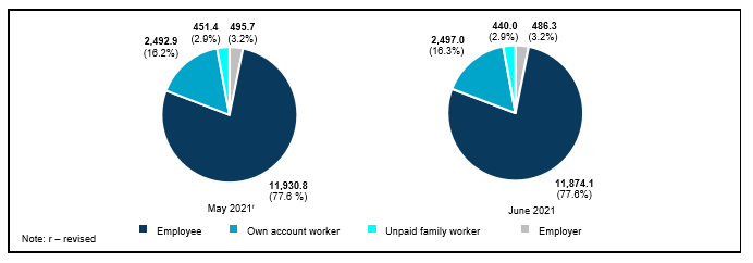 - The largest composition of employed persons was employee’s category with 77.6 per cent. This category reduced by 56.7 thousand persons (-0.5%) to 11.87 million persons as compared to the previous month (May 2021: 11.93 million persons). Meanwhile, own-account workers which comprised mostly of daily income earners working as small business operators such as small retailers; hawkers; sellers in markets and stalls as well as smallholders, recorded an addition of 4.1 thousand persons to 2.50 million persons (May 2021: 2.49 million persons).