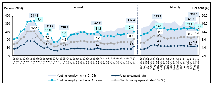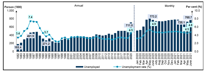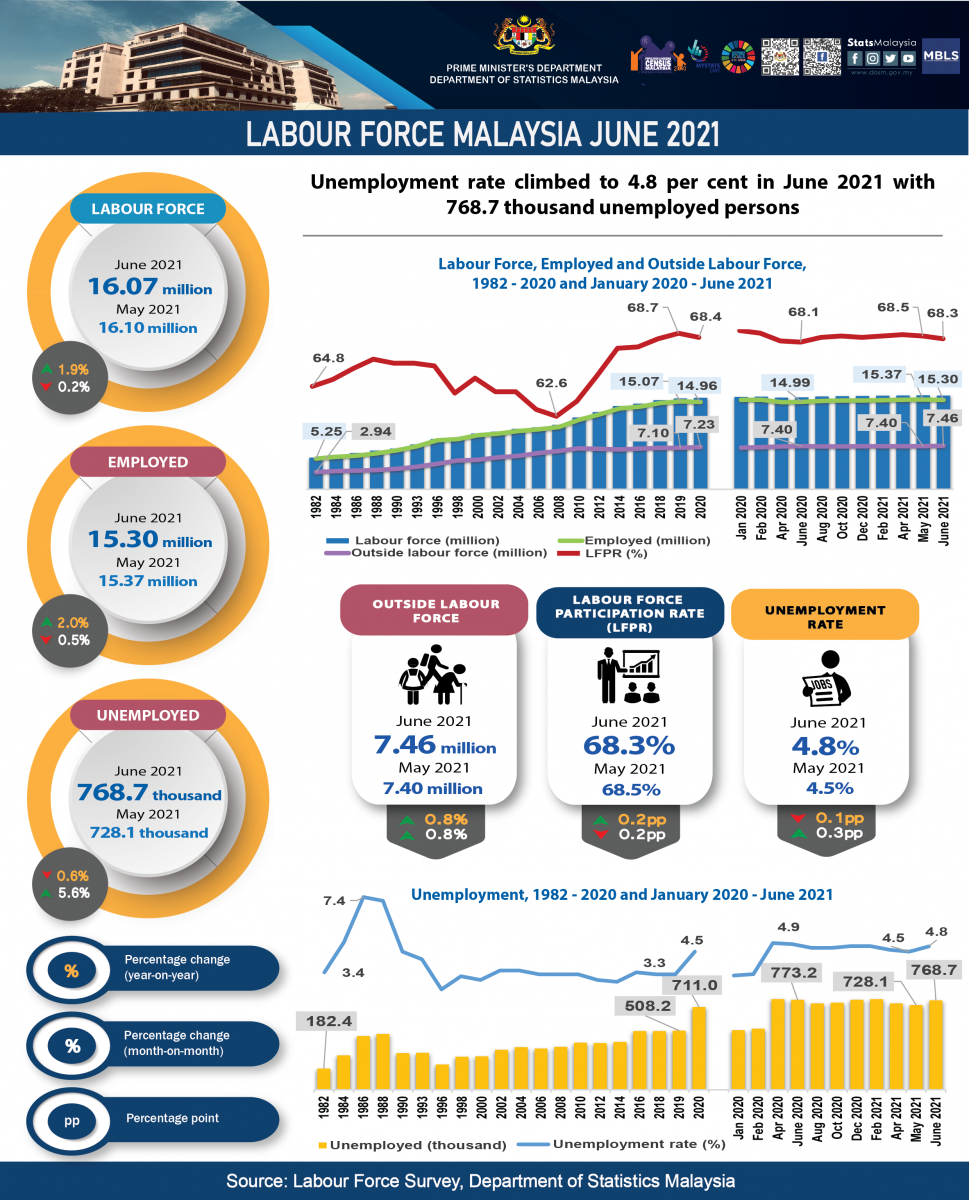 - The unemployment rate in June 2021 climbed to 4.8 per cent (May 2021: 4.5%) after fourconsecutive months of decreases. The number of unemployed persons escalated by 40.6 thousand persons (+5.6%) to 768.7 thousand persons (May 2021: 728.1 thousand persons).