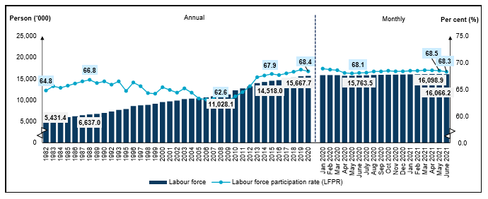 Chart 6: Labour force and LFPR, 1982 – 2020 and January 2020 - June 2021