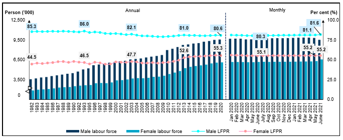 Chart 7: Labour force and LFPR by sex, 1982 - 2020 and January 2020 – June 2021