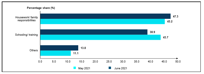 The number of outside labour force in June 2021 continued to increase for the third month, thereby recorded an addition of 58.8 thousand persons (0.8%) to 7.46 million persons (May 2021: 7.40 million persons). Similarly, the number of outside labour force rose by 58.3 thousand persons (0.8%) year-on-year. The largest category of outside labour force was due to the housework/ family responsibilities which comprised of 47.3 per cent and followed by schooling/ training category with 38.9 per cent. [Chart 8]