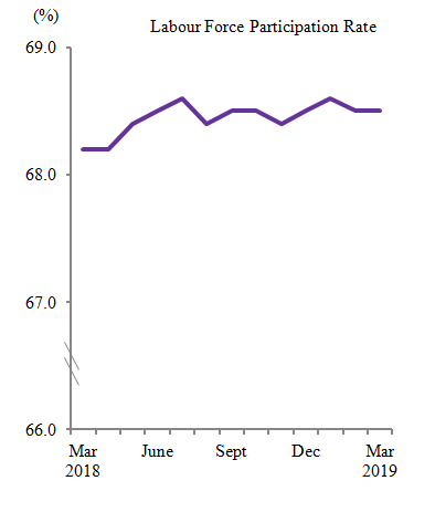 The labour force participation rate remained at 68.5 per cent for two consecutive months, but increased 0.3 percentage points as compared to the same month of previous year (March 2018: 68.2%).
