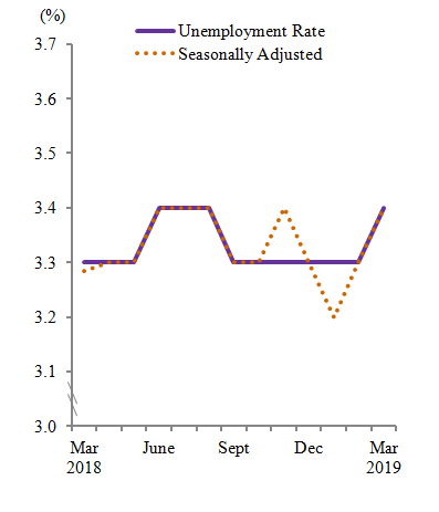 Unemployment rate (seasonally adjusted) in March 2019 increased to 3.4 per cent as compared to 3.3 per cent in the previous month.