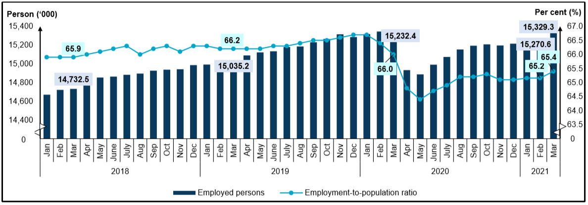 - The number of employed persons continued to post a positive growth in March 2021 by 0.4 per cent (+58.7 thousand persons) month-on-month to 15.33 million persons (February 2021: 15.27 million persons). The employment-to-population ratio which indicates the ability of an economy to create employment rose by 0.2 per cent to record 65.4 per cent.