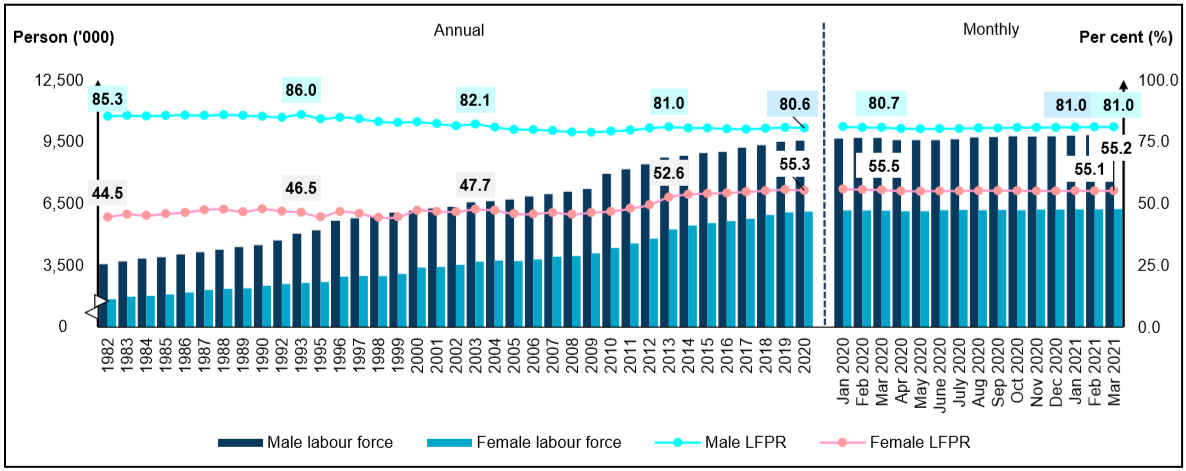 Chart 7: Labour force and LFPR by sex, 1982 - 2020 and January 2020 – March 2021