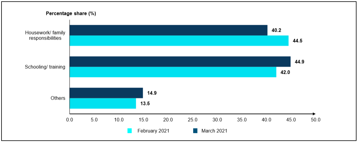 - March 2021 observed the number of outside labour force reduced by 7.6 thousand persons to 7.36 million persons (February 2021: 7.37 million persons). Schooling/ training was the largest composition of outside labour force with 44.9 per cent or 3.31 million persons and followed by housework/ family responsibilities with 40.2 per cent or 2.96 million persons.