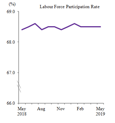 The labour force participation rate remained at 68.5 per cent since February 2019, but increased 0.1 percentage points as compared to the same month of previous year (May 2018: 68.4%).