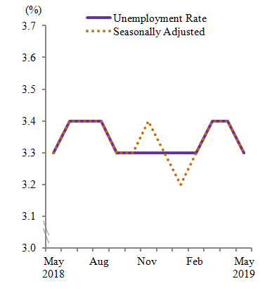 Unemployment rate (seasonally adjusted) in May 2019 declined to 3.3 per cent as compared to 3.4 per cent in the previous month.