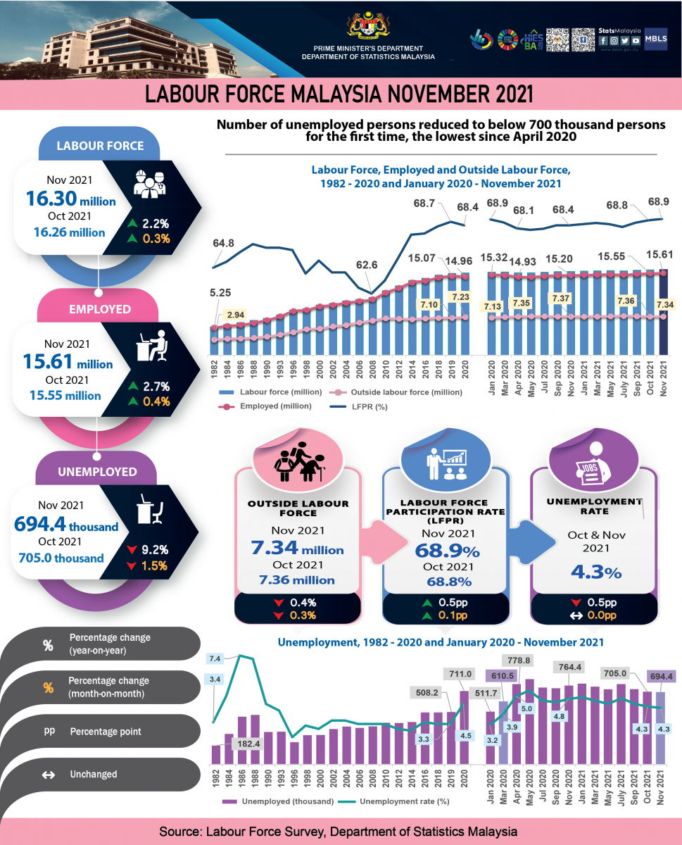 - The unemployed persons in November 2021 reduced to below 700 thousand persons for the first time, the lowest since April 2020 with a decrease of 1.5 per cent month-on-month (-10.6 thousand persons) to 694.4 thousand unemployed persons (October 2021: 705.0 thousand persons). The unemployment rate for the month was 4.3 per cent, unchanged from October 2021 as more in the inactivity group were searching for jobs.
