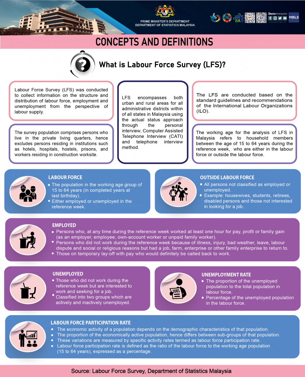 Starting with the monthly release of the Principal Statistics of Labour Force, Malaysia, January 2016, the principal statistics of labour is estimated based on the current population estimates as compared to the previous series which used population projections based on the Population and Housing Census of Malaysia, 2010. This rebase is to obtain statistics that is more consistent with current population structure.