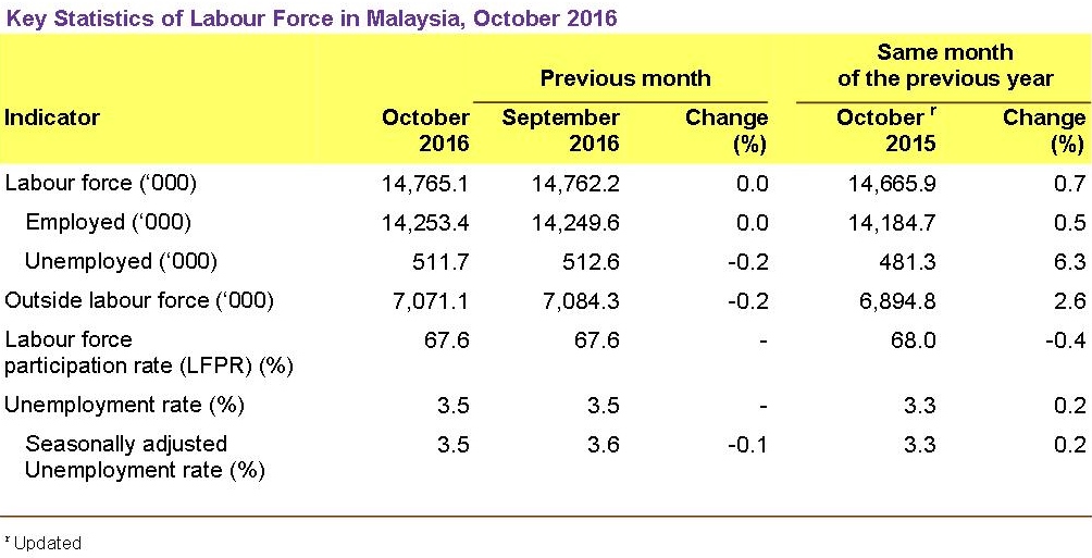 Unemployment rate for October 2016 was 3.5 per cent, same as registered in the previous month. Meanwhile, year-on-year comparison, unemployment rate was 0.2 percentage points higher than October 2015.