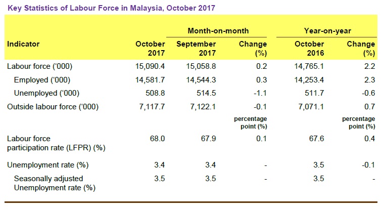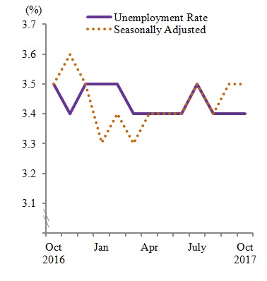 On a seasonally adjusted month-on-month basis, the unemployment rate in October 2017 remained at 3.5 per cent.