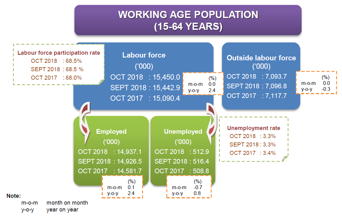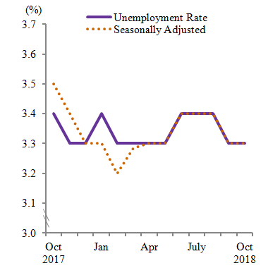 Unemployment rate (seasonally adjusted) in October 2018 also remained at 3.3 per cent.
