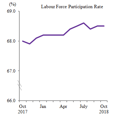 The labour force participation rate remained at 68.5 per cent for the two consecutive months, but increased 0.5 percentage points as compared to the same month of previous year (October 2017: 68.0%).
