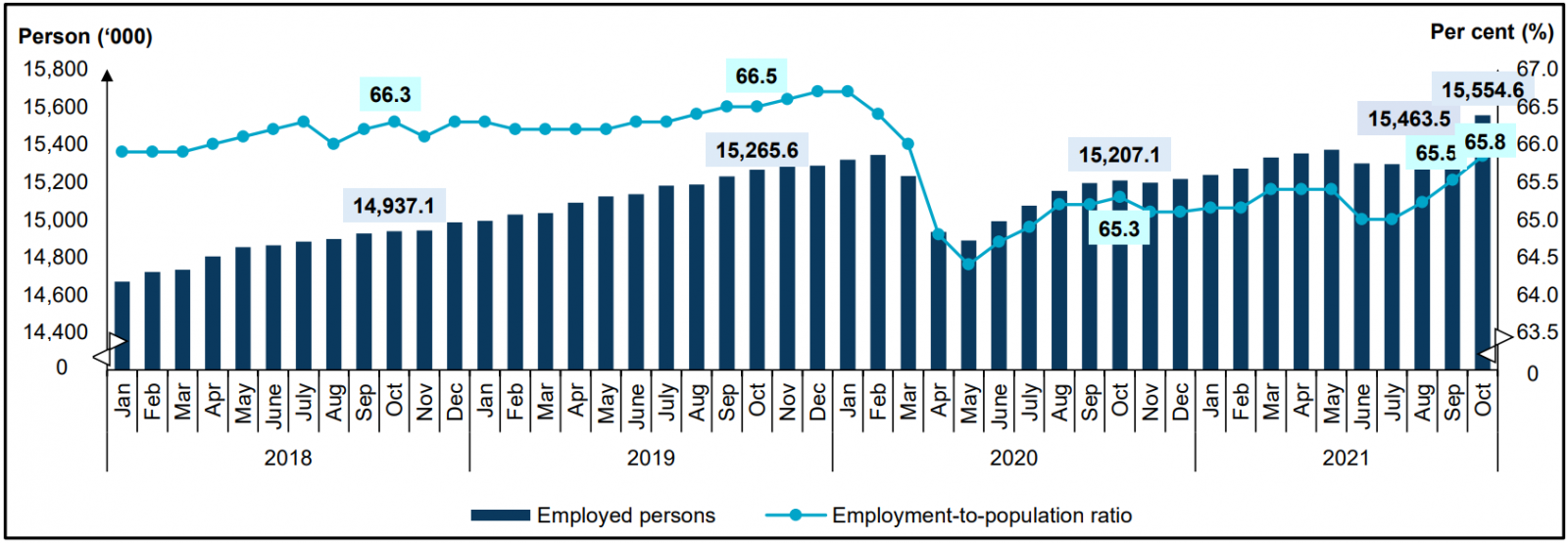 Chart 1: Employed persons and employment-to-population ratio, January 2018 - October 2021
