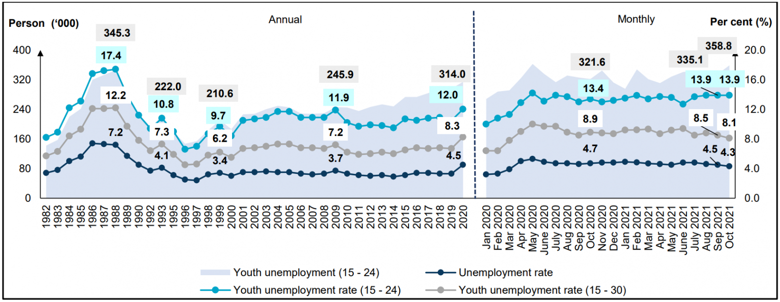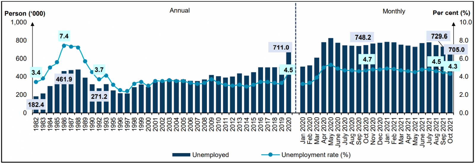 Chart 3: Unemployed persons and unemployment rate, 1982 - 2020 and January 2020 - October 2021