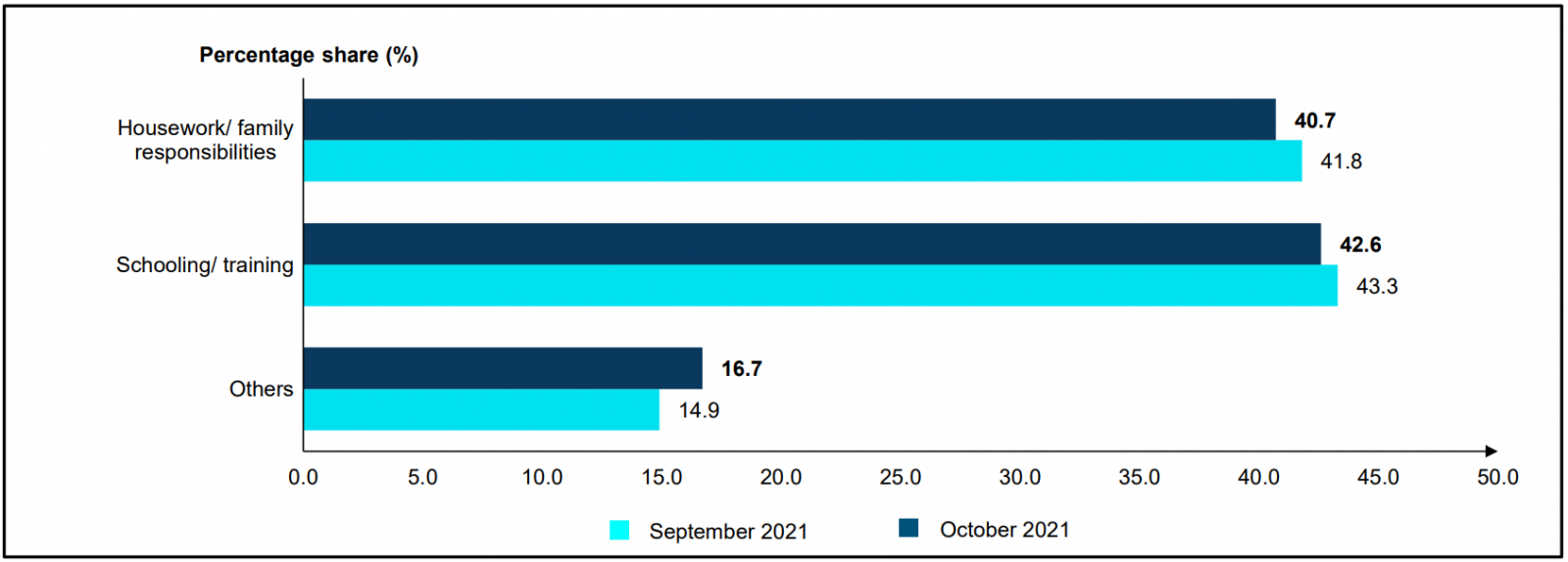 - In October 2021, the number of outside labour force or also known as inactivity group decreased by 41.4 thousand persons (-0.6%) to 7.36 million persons (September 2021: 7.41 million persons). The largest composition of outside labour force was due to schooling/ training which comprised of 42.6 per cent and followed by housework/ family responsibilities category with a share of 40.7 per cent.