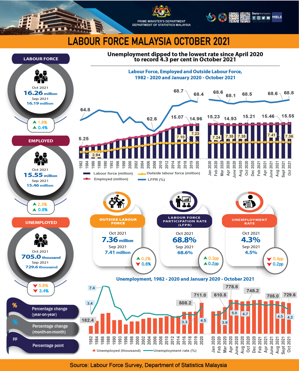 - In October 2021, unemployment dipped to the lowest rate since April 2020 to record 4.3 per cent (September 2021: 4.5%). The number of unemployed persons continued to lessen month-on-month by 3.4 per cent (-24.7 thousand persons) recording 705.0 thousand unemployed persons (September 2021: 729.6 thousand persons). Although the number of unemployed persons was on a declining trend, it remained relatively higher than the pre-pandemic period.