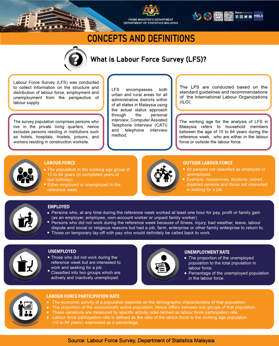 Starting with the monthly release of the Principal Statistics of Labour Force, Malaysia, January 2016, the principal statistics of labour is estimated based on the current population estimates as compared to the previous series which used population projections based on the Population and Housing Census of Malaysia, 2010. This rebase is to obtain statistics that is more consistent with current population structure.