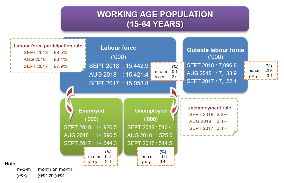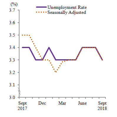 Unemployment rate (seasonally adjusted) in September 2018 reduced to 3.3 per cent as compared to 3.4 per cent in the previous month.