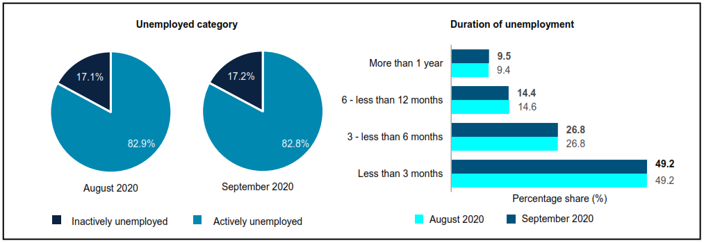 The actively unemployed persons comprise of more than 80 per cent of the total of unemployed persons in September 2020. The largest composition was persons who were unemployed for less than three months with 49.2 per cent.