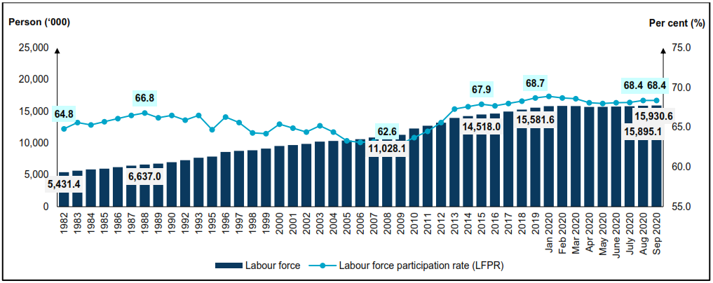 - The labour force participation rate remained at 68.4 per cent in September 2020 after recorded an increase of 0.3 percentage points in the previous month. During the month, the number of labour force increased by 35.5 thousand persons to 15.93 million persons (August 2020: 15.90 million persons).