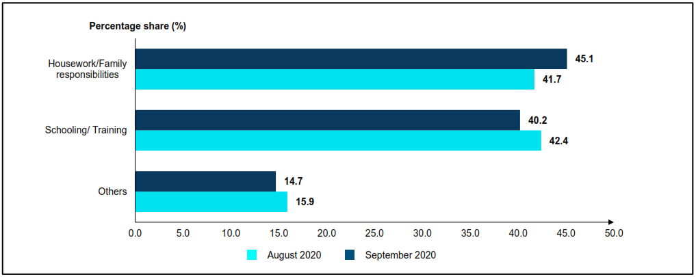 - In September 2020, the number of persons outside labour force increased by 8.3 thousand persons to record 7.36 million persons as against August 2020. Housework/ family responsibility contributed 45.1 per cent followed by schooling/ training with 40.2 per cent.