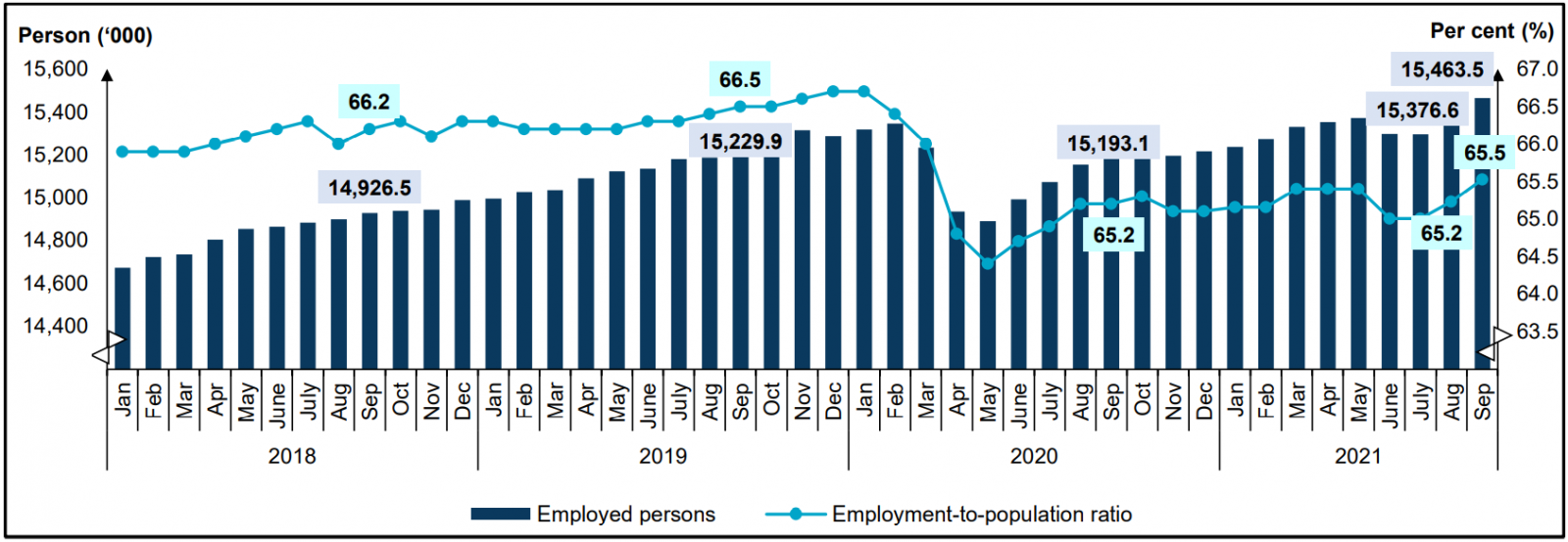 Employed persons continued to increase in September 2021 recording 15.46 million persons