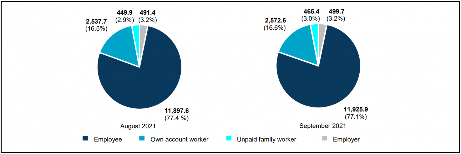 - Out of total employed persons, 77.1 per cent was in the employee’s category which further improved by 28.3 thousand persons (+0.2%) in September 2021 to 11.93 million persons (August 2021: 11.90 million persons). Similarly, the own-account workers increased by 1.4 per cent or 34.8 thousand persons to 2.57 million persons (August 2021: 2.54 million persons).