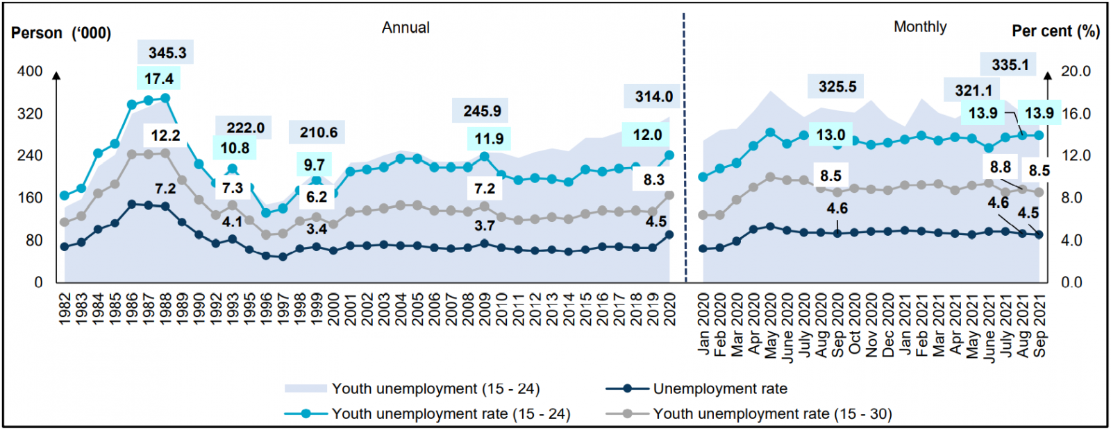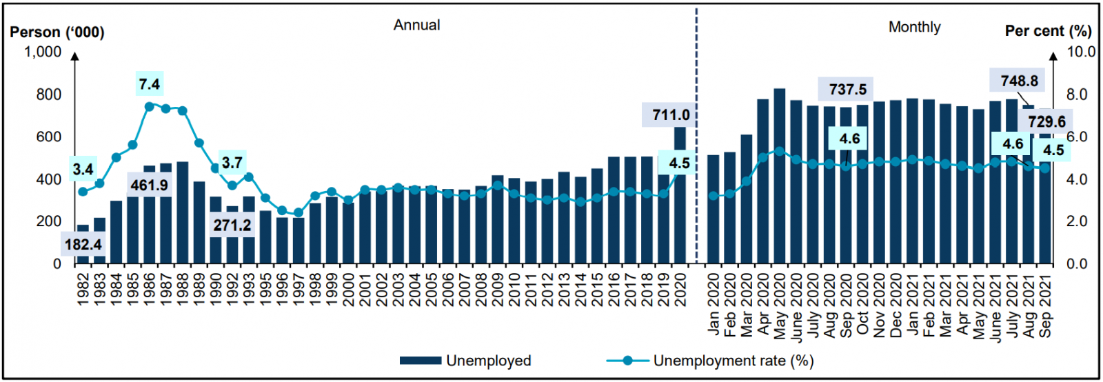 Chart 3: Unemployed persons and unemployment rate, 1982 - 2020 and January 2020 - September 2021