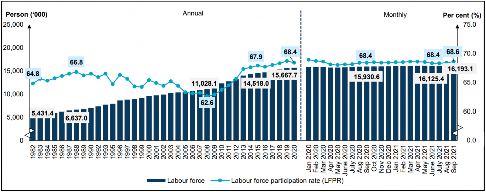 - The number of labour force during the month made up 16.19 million persons, increased by 0.4 per cent or equivalent to 67.7 thousand persons (August 2021: 16.13 million persons). Accordingly, the labour force participation rate (LFPR) rose by 0.2 percentage points to 68.6 per cent (August 2021: 68.4%).