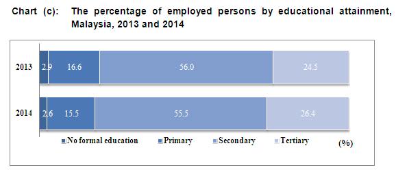 In terms of educational attainment, more than half of the employed persons attained secondary education that is 55.5 per cent in 2014, declined by 0.5 percentage points as compared to 2013. However, the percentage of tertiary educated employed persons rose by 1.9 percentage points to 26.4 per cent in 2014. The percentage of employed persons with primary education and no formal education dropped by 1.1 percentage points and 0.3 percentage points respectively.
