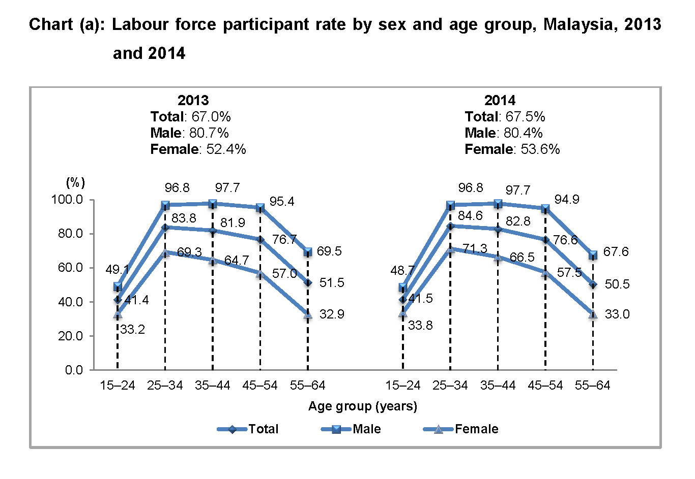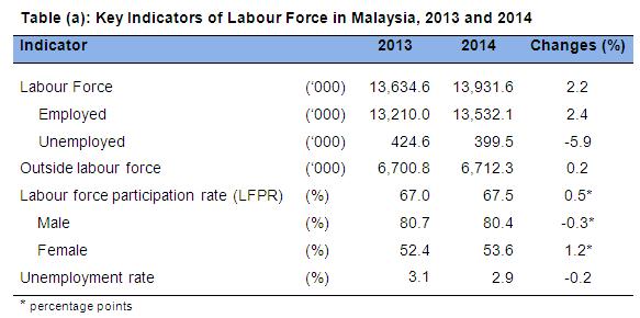The labour market in Malaysia has demonstrated increase in the labour force participation rate to 67.5 per cent in 2014. The increase of 0.5 percentage point was contributed by the rise in the number of employed persons by 322.1 thousand persons to 13.5 million persons out of the total labour force of 13.9 million persons.