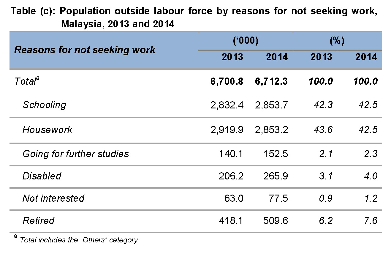 The population outside the labour force in 2014 was 6.7 million. Among the main factors are due to attending schools and planned to further studies (44.8%), followed by housework that is 42.5 per cent.