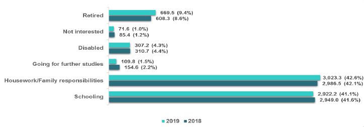 A majority of those outside labour force were housework/ family responsibilities and schooling. These groups had the potential to join the labour market