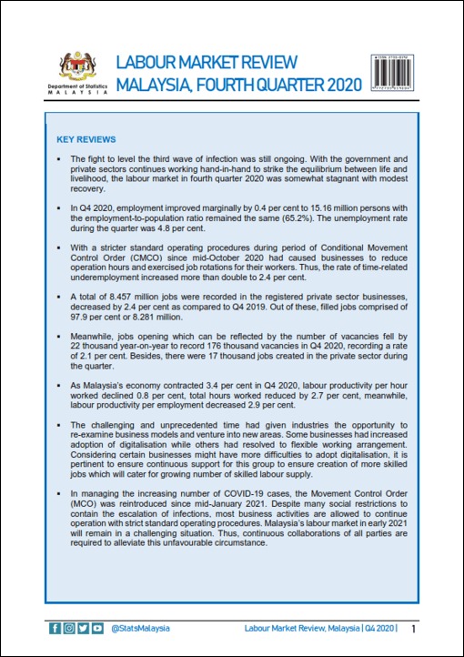 The report is divided into three segments to provide readers the different aspects of labour market information encompassing Labour Supply, Labour Demand and Labour Productivity. The special feature of the report is for every quarter, there is an article highlighting the most recent labour market issues through statistics; or delving on the methodologies to strengthen labour market statistics. LMR fourth quarter (Q4) 2020 presents an article entitled ‘Initial Review of Labour Migration in Malaysia’. This edition of LMR also features a snapshot of the labour market situation for the year 2020.