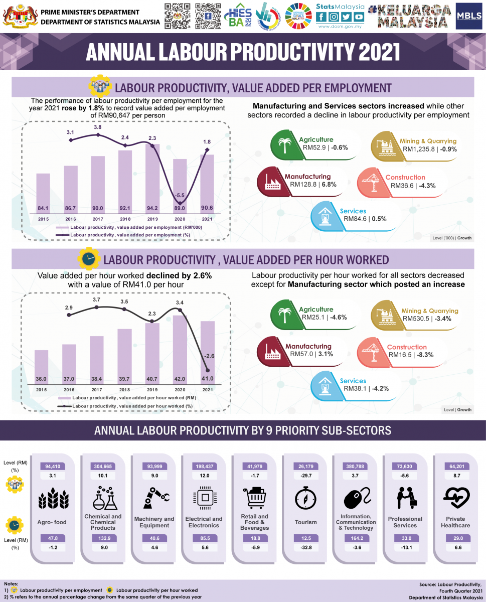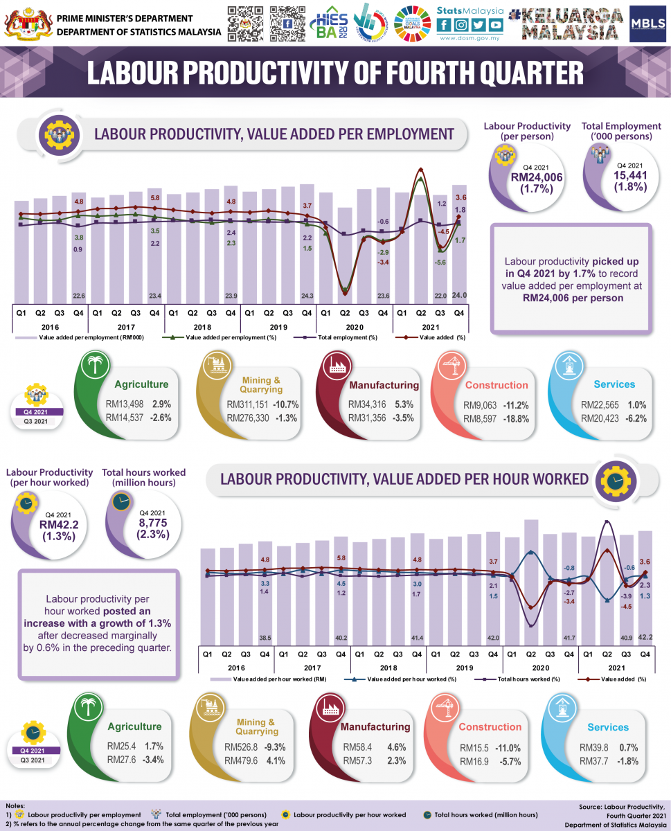 The detailed information and technical notes are published in the publication of Labour Productivity Fourth Quarter 2021. This report is accessible and downloadable free of charge through the eStatistik application in DOSM web page, www.dosm.gov.my.