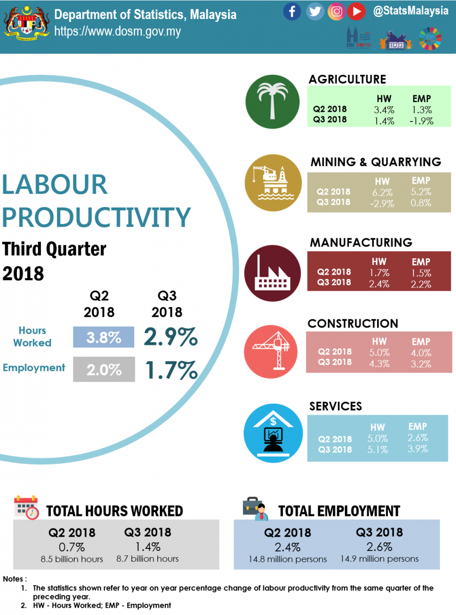 Malaysia’s labour productivity, as measured by value added per hour worked, rose 2.9 per cent in the third quarter of 2018 after registering 3.8 per cent in Q2 2018. During this quarter, Malaysia’s Gross Domestic Product (GDP) grew 4.4 per cent (Q2 2018: 4.5%) while hours worked increased 1.4 per cent (Q2 2018: 0.7%).