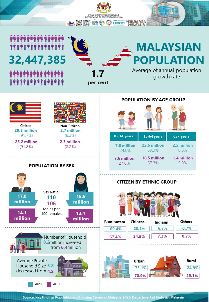 The population of Malaysia comprises 91.7 per cent of Citizens amounting to 29.8 million and 8.3 per cent of Non-Citizens accounted 2.7 million. The Citizens population grew at a slower rate of 1.7 per cent (2010: 1.9%) per annum between 2010 and 2020, while Non -Citizens increased 1.8 per cent per annum over the same period.