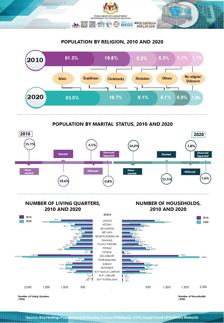 MyCensus 2020 comprises 108 questions is a high-impact investment to the nation (RM413.9 million) produces new National baseline data on social, economic and environmental statistical dimensions. Meanwhile, the main demographics obtained from the MyCensus 2020 include population, households, living quarters, sex, age, citizenship, ethnicity, religion and marital status. More than 1,000 MyCensus 2020 reports covering 16 states, 160 administrative districts, 222 parliaments and 600 state legislative assemblies will be published in stages from February 2022 to 2024.