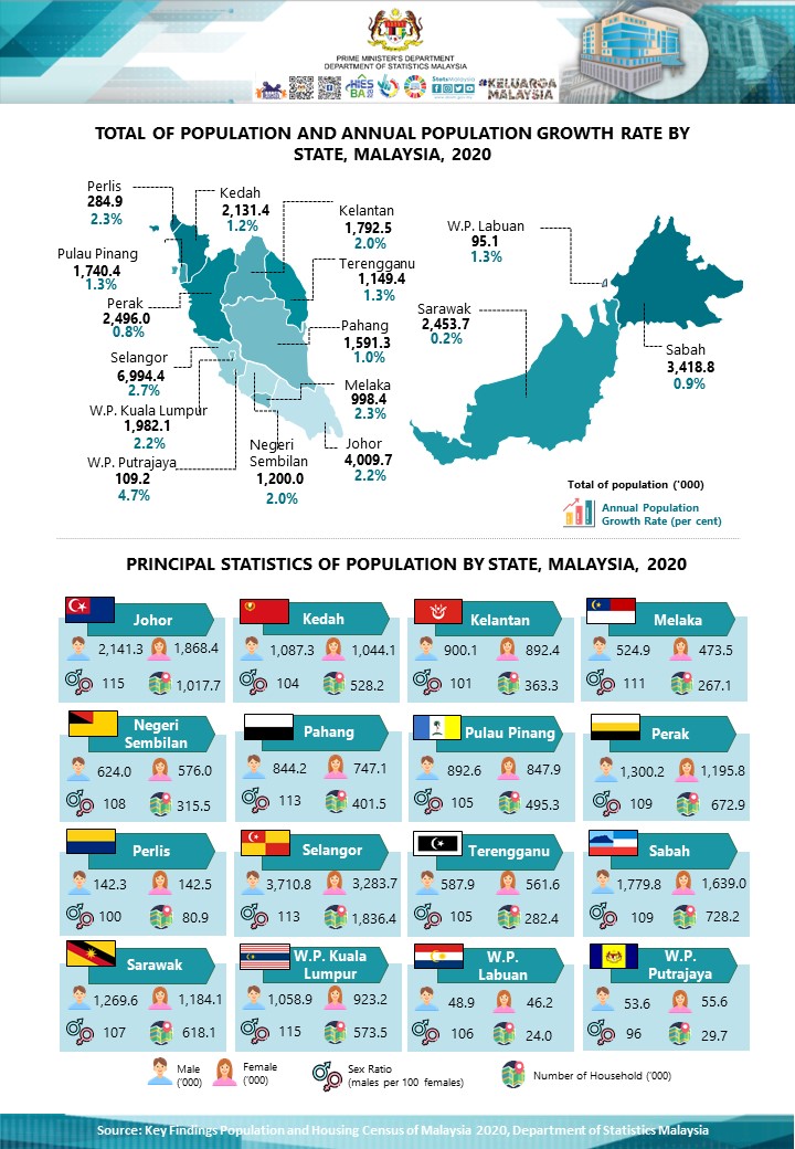The total population of Malaysia in 2020 was 32.4 million as compared to 27.5 million in 2010. Malaysia's population grew at a slower rate of 1.7 per cent a year between 2010 and 2020 as compared to 2.2 per cent a year between 2000 and 2010.