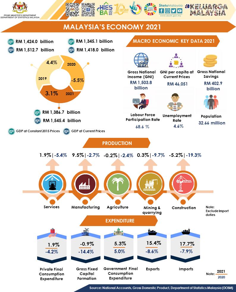 Malaysia’s economy regained its momentum in 2021, with a 3.1 per cent growth from the previous year negative 5.5 per cent. The performance was driven by the Services and Manufacturing sectors, which constituted 81.3 per cent of total Gross Domestic Product (GDP). In terms of demand, Private final consumption expenditure remained the largest component with a share of 58.8 per cent in 2021.