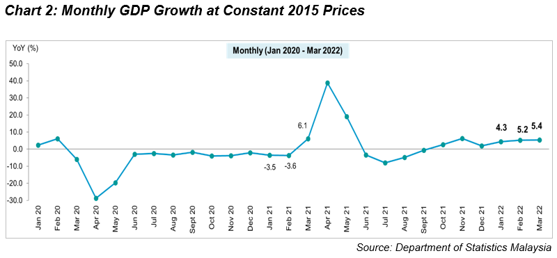 Malaysia’s GDP expanded further 5.0 per cent as compared to 3.6 per cent in the previous quarter. In terms of seasonally adjusted, GDP moderated at 3.9 per cent (Q4 2021: 4.6%) in this quarter. Correspondingly, the monthly economic performance showed a better growth from January to March 2022. GDP performance in January 2022 grew 4.3 per cent, risen to 5.2 per cent and 5.4 per cent in February and March 2022 respectively. From the current economic standing, the economic performance for the first quarter of 2022 has surpassed the level of first quarter 2019 by 5.2 per cent or RM17.9 billion.