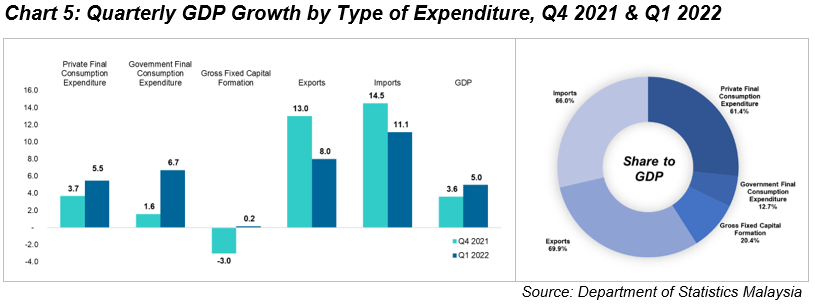 Exports moderated 8.0 per cent (Q4 2021: 13.0%) influenced by Exports of goods which eased 7.1 per cent (Q4 2021:12.9%). On the other hand, Imports grew stronger 11.1 per cent (Q4 2021: 14.5%) following better performance in import of goods at 11.3 per cent (Q4 2021: 15.2%). This has resulted a contraction of 26.5 per cent in Net exports as compared to 0.8 per cent in the preceding quarter.