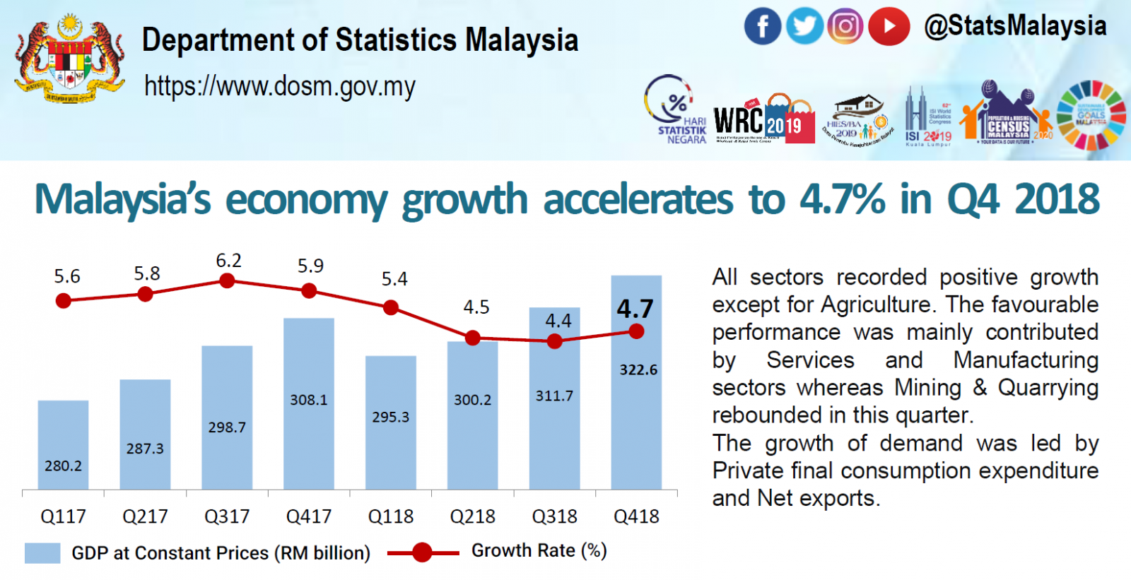 In the fourth quarter of 2018, Malaysia's economy recorded a better performance with a growth of 4.7 per cent after the moderation of two consecutive quarter in 2018. All key sectors recorded positive growth except for Agriculture. The favourable performance was mainly contributed by Services and Manufacturing sectors, whereas Mining & Quarrying rebounded in this quarter. The growth of demand was led by Private final consumption expenditure and Net exports.