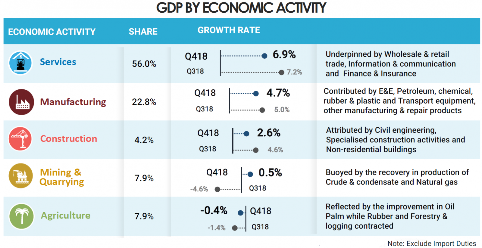 Manufacturing sector moderated 4.7 per cent against 5.0 per cent in the previous quarter. Electrical, Electronic & Optical products continued to be the main contributor in this sector expanded further 6.9 per cent backed by printed circuit board, electronic integrated circuit micro assembles and communication equipment. Meanwhile, Petroleum, Chemical, Rubber & Plastic products registered a growth of 3.6 per cent which attributed by refined petroleum, rubber and plastic products. The performance of Manufacturing in this quarter was further spurred by Transport equipment, other manufacturing & repair which augmented further to 8.7 per cent. The sturdy growth of this activity was induced by motor vehicles and transport equipment. Manufacturing sector grew 5.0 per cent in 2018 after registering 6.0 per cent in 2017.