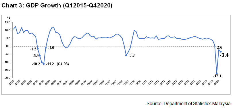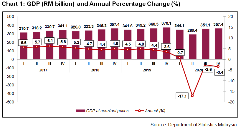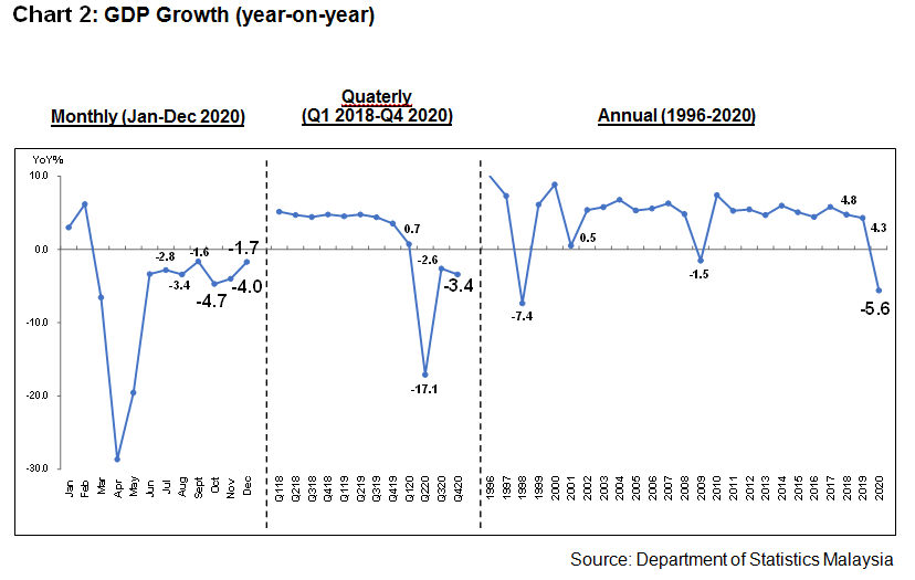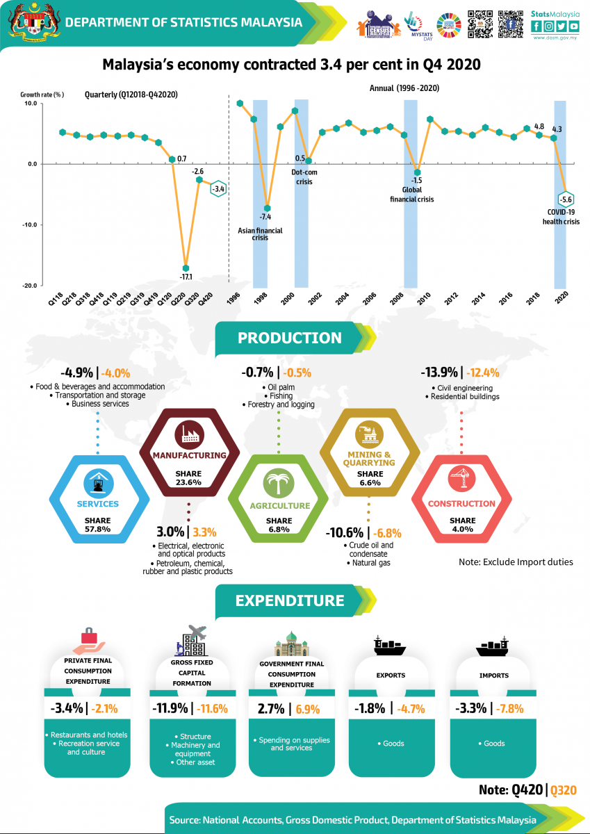 Malaysia’s Gross Domestic Product (GDP) contracted 3.4 per cent for the fourth quarter of 2020 as compared to a decline of 2.6 per cent in the preceding quarter. For overall year 2020, Malaysia’s GDP contracted 5.6 per cent as compared to 4.3 per cent in 2019. The last seen of Malaysia’s economic contracted was in 2009 (-1.5%) and this is the lowest contraction after 1998 (-7.4%).