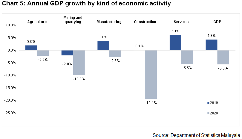 Overall, the COVID-19 pandemic that hit the world has affected the Malaysian economy. GDP performance for 2020 declined 5.6 per cent as compared to a positive growth of 4.3 per cent in 2019 influenced by the fall of all economic sectors. Services sector recorded a negative growth of 5.5 per cent (2019: 6.1%) followed by Manufacturing sector contracted 2.6 per cent (2019: 3.8%). Subsequently, Agriculture sector recorded a decline of 2.2 per cent (2019: 2.0%), Mining & quarrying at negative 10.0 per cent (2019: -2.0%) and Construction sector decreased 19.4 per cent (2019: 0.1%).